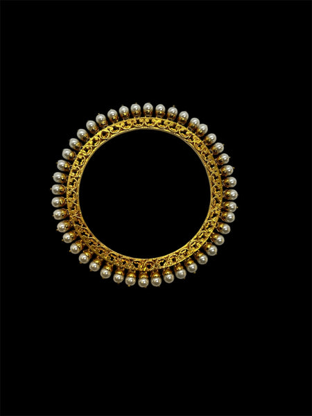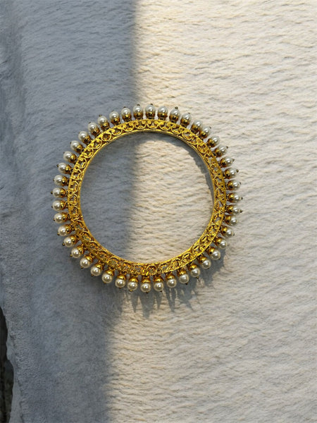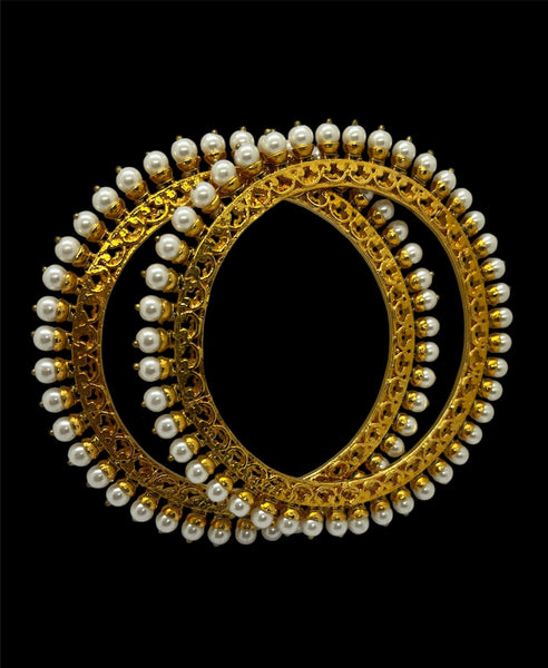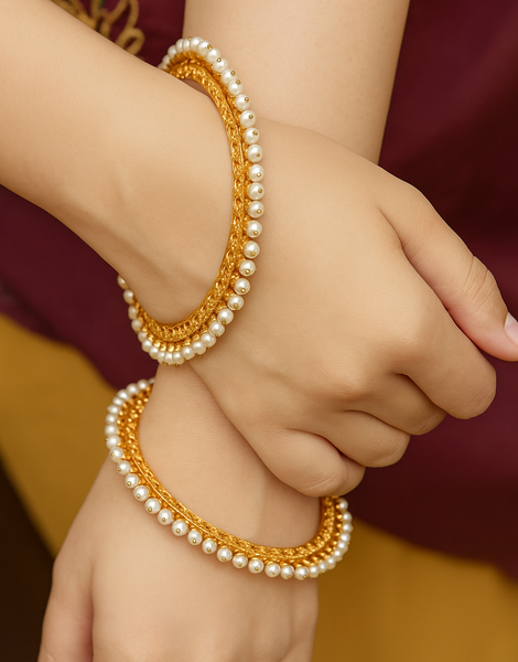 Each bangle is meticulously lined with dozens of delicate, creamy white pearls, creating a rich and classic aesthetic.