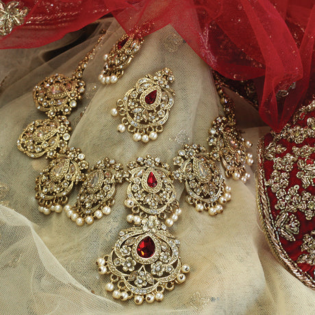 This piece is handcrafted with Siam, golden shadow, and clear crystals, accented with cream pearls and finished in antique gold plating.