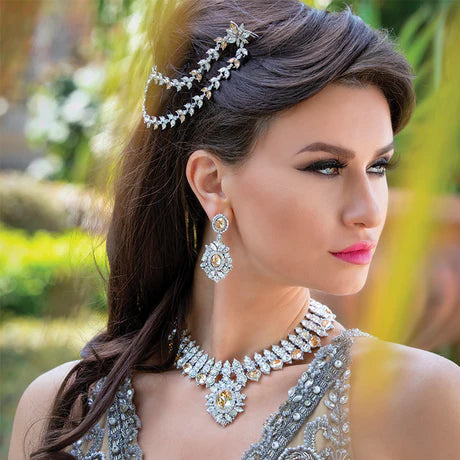 This set (pictured) is handcrafted with golden shadow and clear crystals on a rhodium (silver) plating. For support with customisations, contact us.