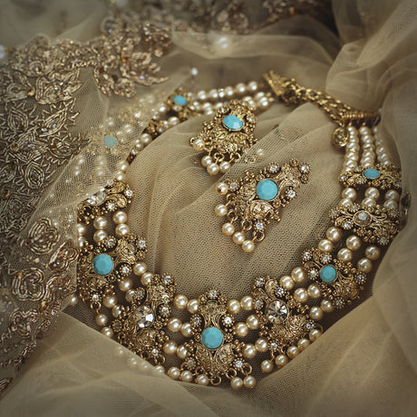 This set features meticulous handcrafting with turquoise and clear crystals, accented by cream pearls and finished in antique gold plating.